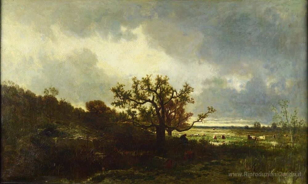 Ti offriamo una riproduzione artigianale su tela dell'opera famosa 'Paesaggio con Oaktree' di Jules Dupre, dal Museo delle Riproduzioni.