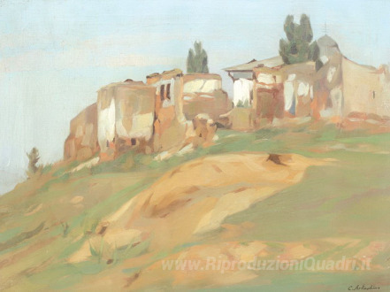 Ti offriamo una riproduzione artigianale su tela dell'opera famosa 'Paesaggio con rovine' di Constantin Artachino, dal Museo delle Riproduzioni.