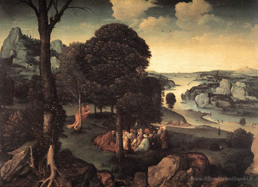 Ti offriamo una riproduzione artigianale su tela dell'opera famosa 'Paesaggio con San Giovanni Battista predica' di Joachim Patinir, dal Museo delle Riproduzioni.