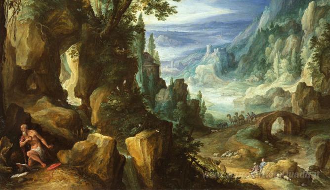 Ti offriamo una riproduzione artigianale su tela dell'opera famosa 'Paesaggio con San Girolamo e balza rocciosa' di Paul Bril, dal Museo delle Riproduzioni.