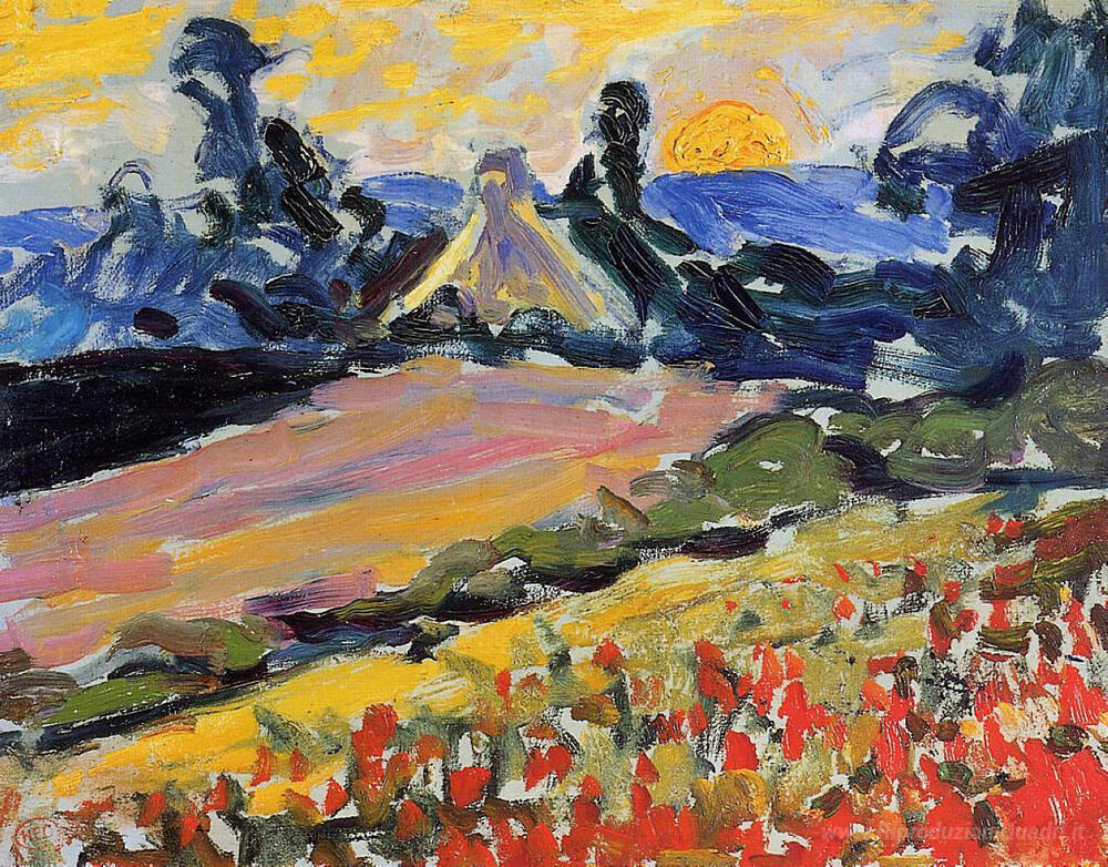 Scopri l'incanto del Paesaggio con tramonto, un'opera straordinaria del maestro impressionista Henri-Edmond Cross. Questo dipinto a olio, realizzato con una sapiente combinazione di colori vivaci e delicate pennellate, cattura la magia del crepuscolo, trasmettendo un senso di pace e armonia. La luce calda e avvolgente del tramonto riecheggia sopra un paesaggio lussureggiante, invitando lo spettatore a immergersi in una realtà incantevole.