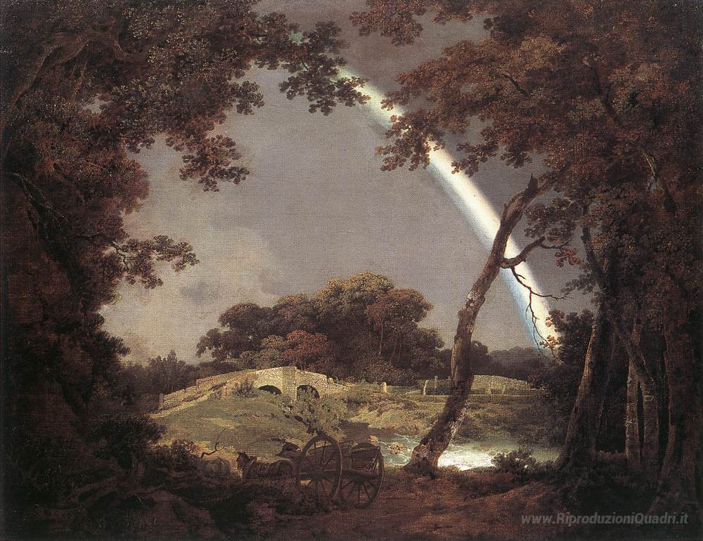 Ti offriamo una riproduzione artigianale su tela dell'opera famosa 'Paesaggio con un arcobaleno' di Joseph Wright, dal Museo delle Riproduzioni.