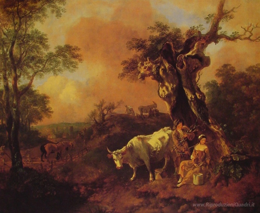 Ti offriamo una riproduzione artigianale su tela dell'opera famosa 'Paesaggio con un Boscaiolo e lattaia' di Thomas Gainsborough, dal Museo delle Riproduzioni.