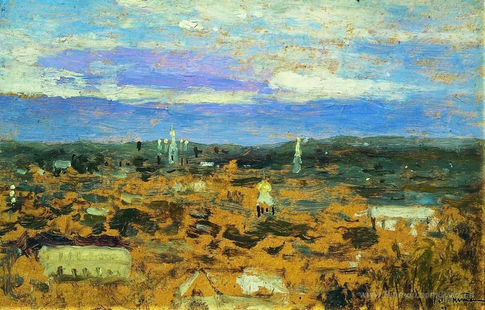 Ti offriamo una riproduzione artigianale su tela dell'opera famosa 'Paesaggio con un convento' di Isaac Levitan, dal Museo delle Riproduzioni.