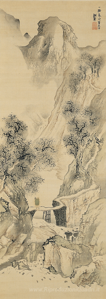 Ti offriamo una riproduzione artigianale su tela dell'opera famosa 'Paesaggio con un viaggiatore solitario' di Yosa Buson, dal Museo delle Riproduzioni.