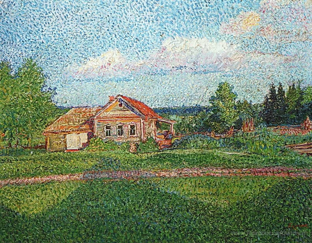Ti offriamo una riproduzione artigianale su tela dell'opera famosa 'Paesaggio con una casa' di David Burliuk, dal Museo delle Riproduzioni.