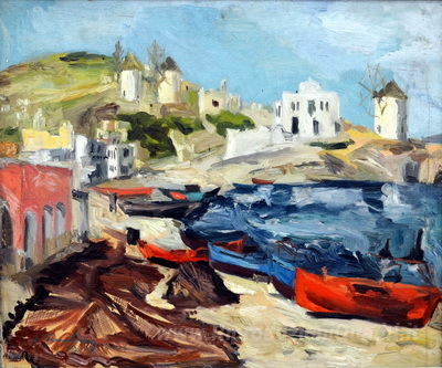 Ti offriamo una riproduzione artigianale su tela dell'opera famosa 'Paesaggio da Paros' di Ion Tuculescu, dal Museo delle Riproduzioni.