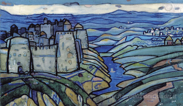 Ti offriamo una riproduzione artigianale su tela dell'opera famosa 'Paesaggio del Nord con fortezza' di Nicholas Roerich, dal Museo delle Riproduzioni.