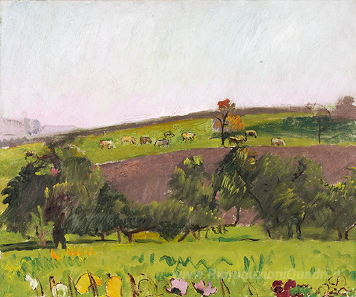 Ti offriamo una riproduzione artigianale su tela dell'opera famosa 'Paesaggio dell'Emmental con animali al pascolo' di Cuno Amiet, dal Museo delle Riproduzioni.