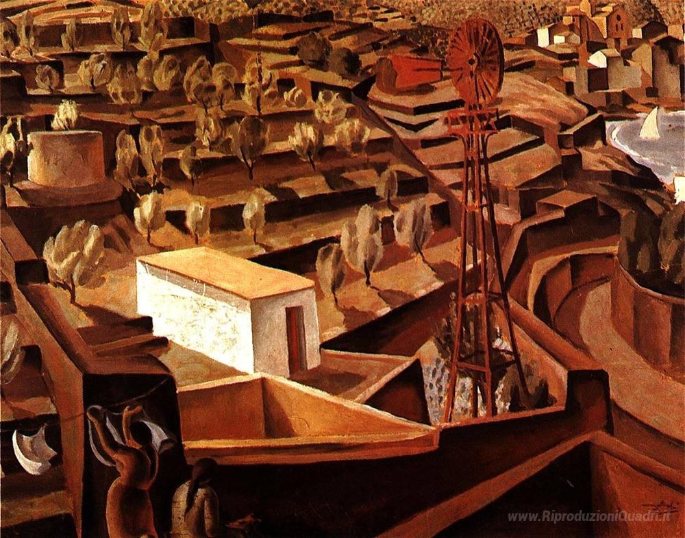Ti offriamo una riproduzione artigianale su tela dell'opera famosa 'Paesaggio di Cadaques' di Salvador Dali, dal Museo delle Riproduzioni.