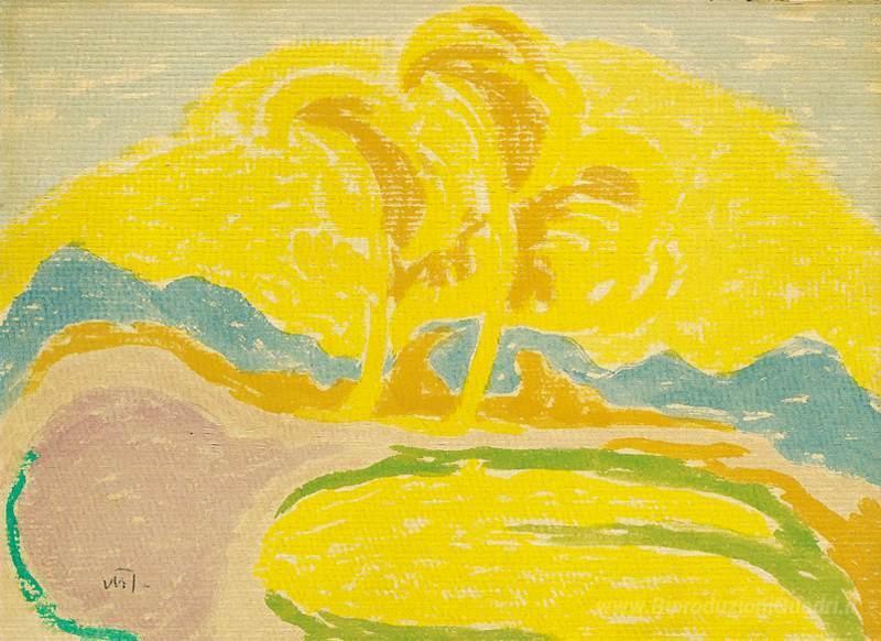 Ti offriamo una riproduzione artigianale su tela dell'opera famosa 'Paesaggio Giallo' di Janos Mattis-Teutsch, dal Museo delle Riproduzioni.