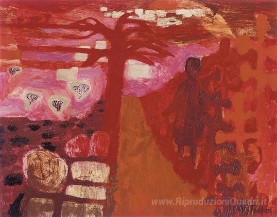 Ti offriamo una riproduzione artigianale su tela dell'opera famosa 'Paesaggio in Gozo' di Mary Fedden, dal Museo delle Riproduzioni.