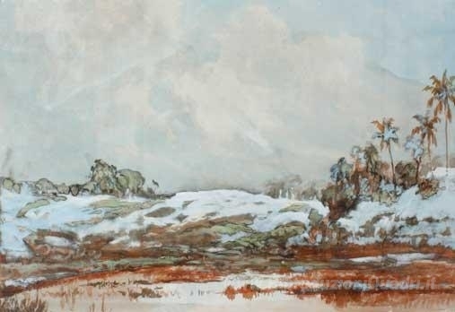 Ti offriamo una riproduzione artigianale su tela dell'opera famosa 'Paesaggio indonesiano' di Abdullah Suriosubroto, dal Museo delle Riproduzioni.