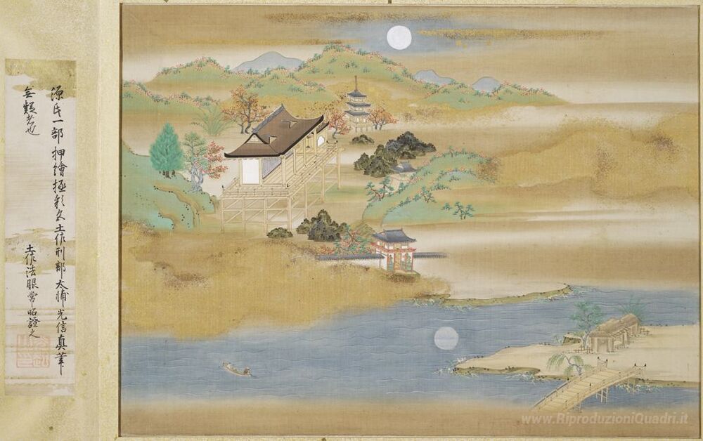 Ti offriamo una riproduzione artigianale su tela dell'opera famosa 'Paesaggio intorno Ishiyama-dera e lago Biwa' di Tosa Mitsuoki, dal Museo delle Riproduzioni.