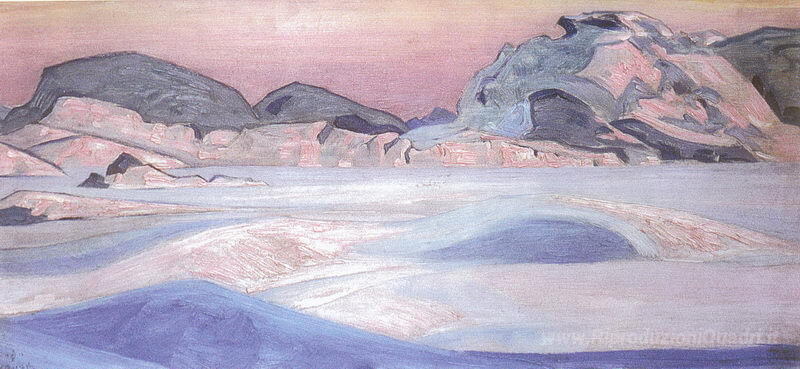 Ti offriamo una riproduzione artigianale su tela dell'opera famosa 'Paesaggio invernale' di Nicholas Roerich, dal Museo delle Riproduzioni.