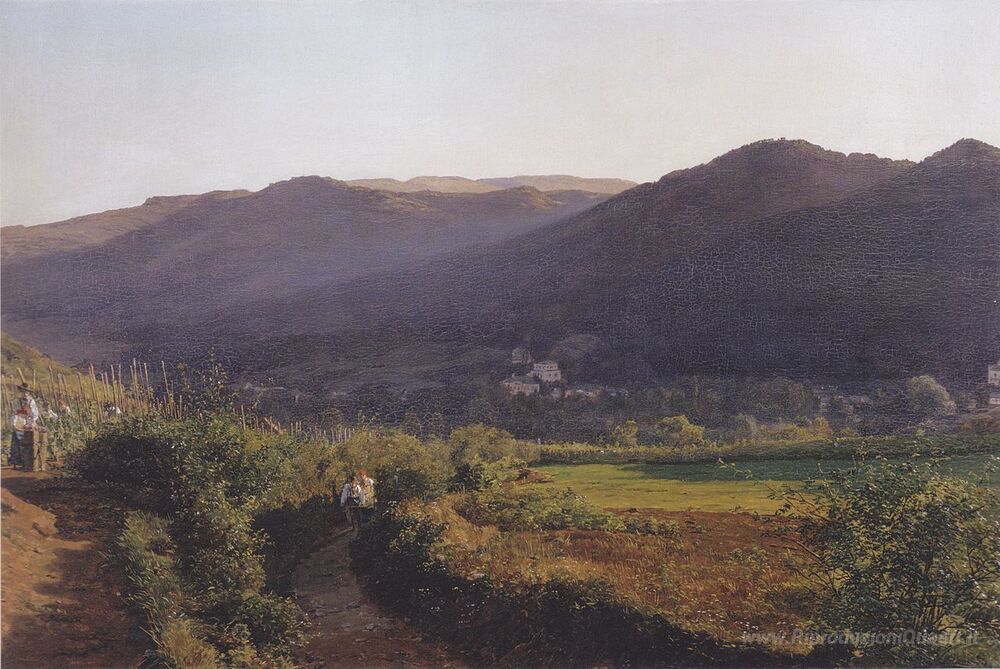 Ti offriamo una riproduzione artigianale su tela dell'opera famosa 'Paesaggio montano con vigna' di Ferdinand Georg Waldmüller, dal Museo delle Riproduzioni.