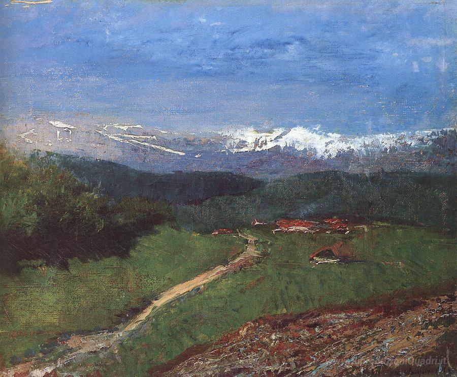 Ti offriamo una riproduzione artigianale su tela dell'opera famosa 'Paesaggio nelle Alpi (Vista dal Rax)' di Laszlo Mednyanszky, dal Museo delle Riproduzioni.