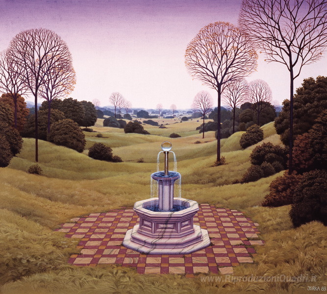 Ti offriamo una riproduzione artigianale su tela dell'opera famosa 'Paesaggio Olandese' di Jacek Yerka, dal Museo delle Riproduzioni.