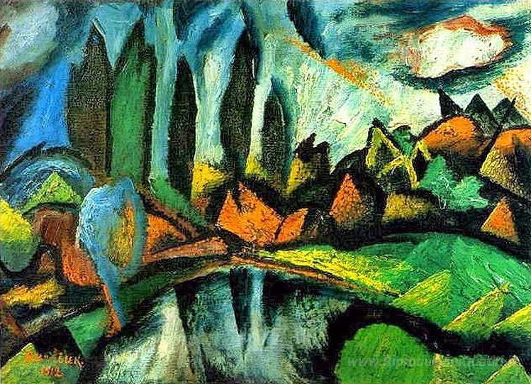 Ti offriamo una riproduzione artigianale su tela dell'opera famosa 'Paesaggio' di David Burliuk, dal Museo delle Riproduzioni.