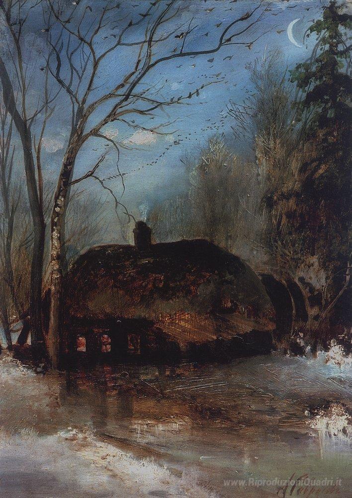 Ti offriamo una riproduzione artigianale su tela dell'opera famosa 'Paesaggio primaverile con cottage' di Aleksey Savrasov, dal Museo delle Riproduzioni.