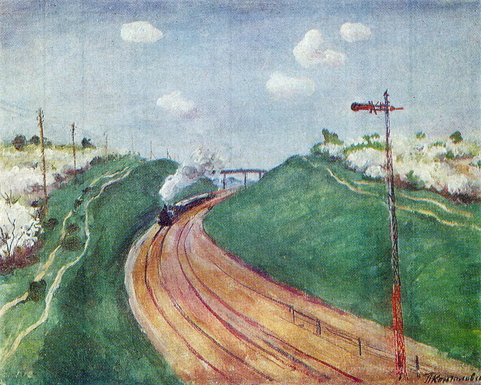 Ti offriamo una riproduzione artigianale su tela dell'opera famosa 'Paesaggio primaverile con il treno' di Pyotr Konchalovsky, dal Museo delle Riproduzioni.