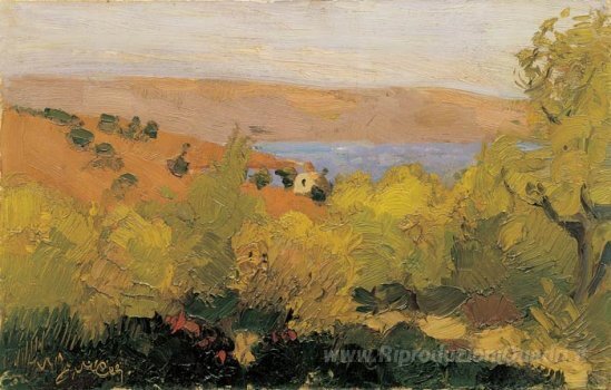 Ti offriamo una riproduzione artigianale su tela dell'opera famosa 'Paesaggio, Sounion' di Nikolaos Lytras, dal Museo delle Riproduzioni.