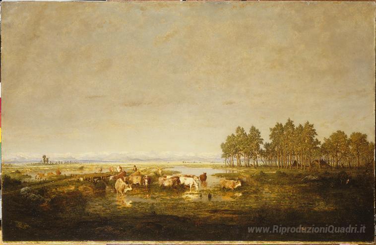 Ti offriamo una riproduzione artigianale su tela dell'opera famosa 'Paludoso nel Landes' di Theodore Rousseau, dal Museo delle Riproduzioni.