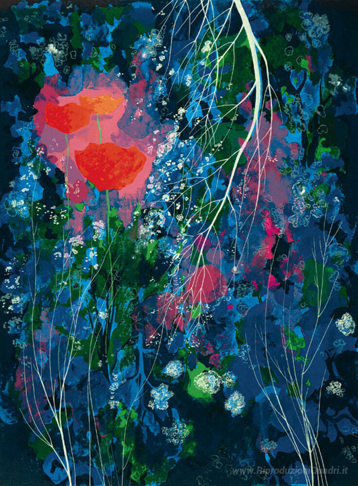 Ti offriamo una riproduzione artigianale su tela dell'opera famosa 'Papaveri' di Eyvind Earle, dal Museo delle Riproduzioni.
