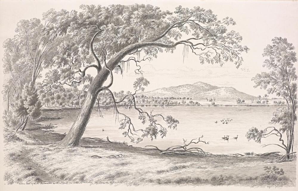 Ti offriamo una riproduzione artigianale su tela dell'opera famosa 'Parte occidentale del Lago Keilambete e il monte Noorat, un vulc' di Eugene von Guerard, dal Museo delle Riproduzioni.
