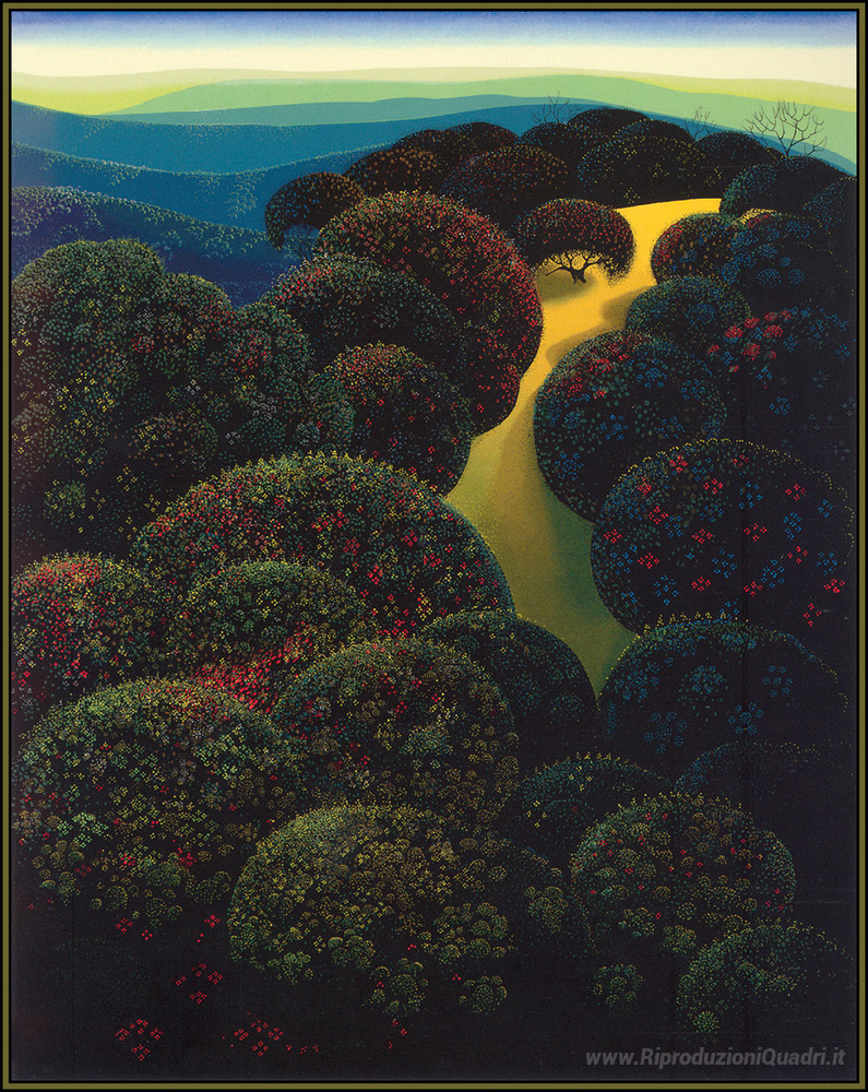 Ti offriamo una riproduzione artigianale su tela dell'opera famosa 'Pascolo Hidden' di Eyvind Earle, dal Museo delle Riproduzioni.