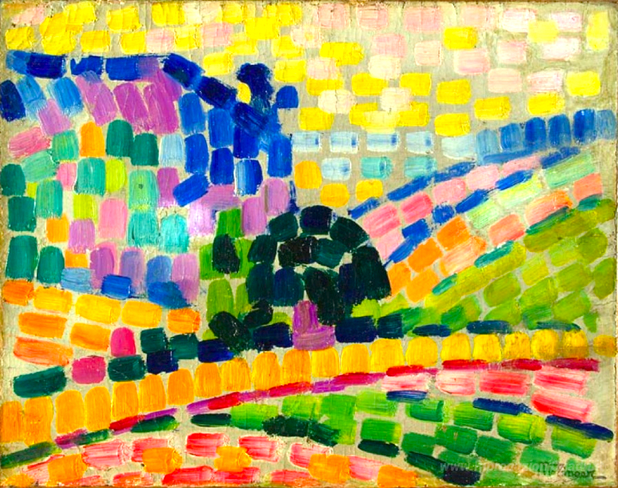 Ti offriamo una riproduzione artigianale su tela dell'opera famosa 'Paysage à l'arbre rond (Paesaggio con un albero tondo)' di Jean Metzinger, dal Museo delle Riproduzioni.
