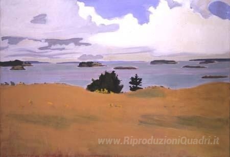 Ti offriamo una riproduzione artigianale su tela dell'opera famosa 'Penobscot Bay con Campo Giallo' di Fairfield Porter, dal Museo delle Riproduzioni.