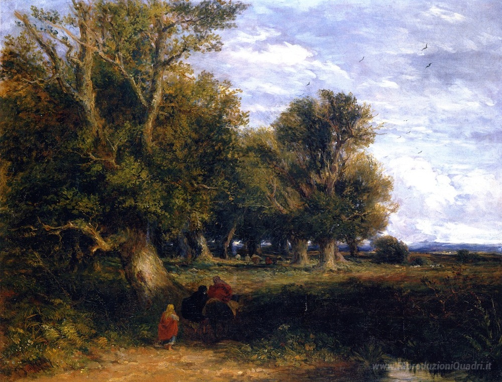 Ti offriamo una riproduzione artigianale su tela dell'opera famosa 'Periferia di un legno, con gli Zingari' di David Cox, dal Museo delle Riproduzioni.