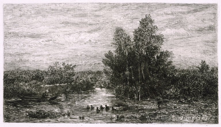 Ti offriamo una riproduzione artigianale su tela dell'opera famosa 'Pescatore sul fiume con le anatre' di Charles-Francois Daubigny, dal Museo delle Riproduzioni.