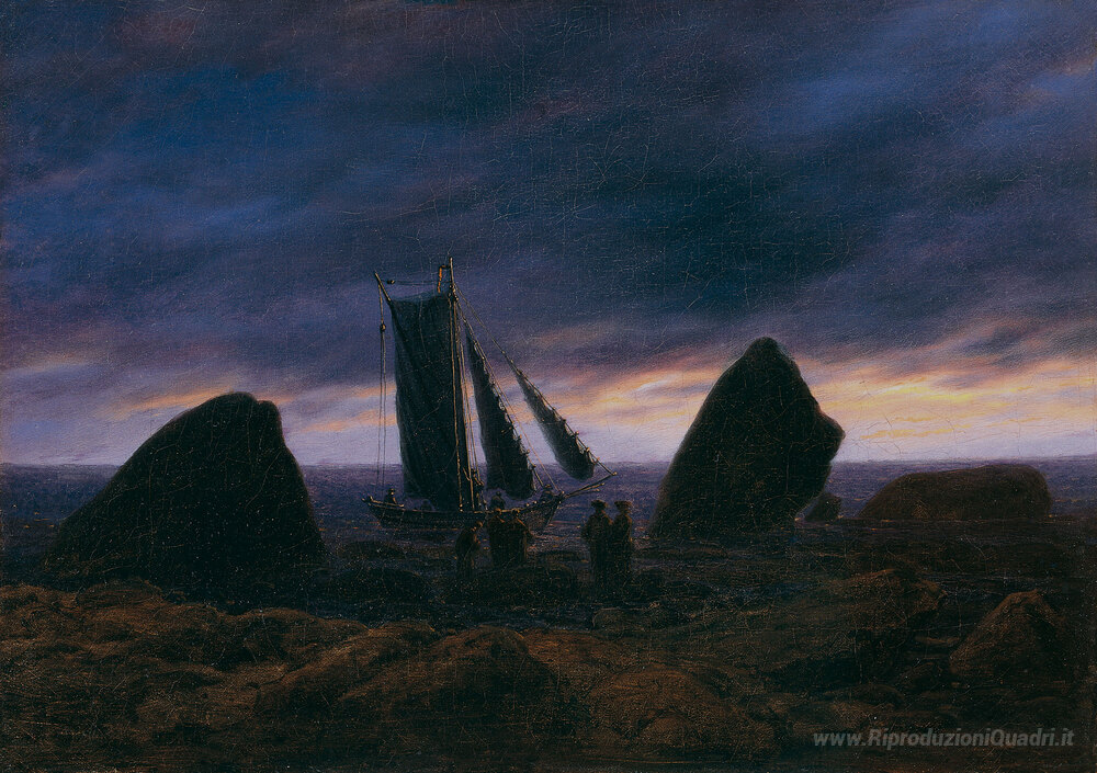 Ti offriamo una riproduzione artigianale su tela dell'opera famosa 'Peschereccio tra due rocce sulla spiaggia del Mar Baltico' di Caspar David Friedrich, dal Museo delle Riproduzioni.