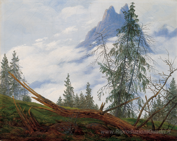 Ti offriamo una riproduzione artigianale su tela dell'opera famosa 'Picco di montagna con le Nuvole' di Caspar David Friedrich, dal Museo delle Riproduzioni.