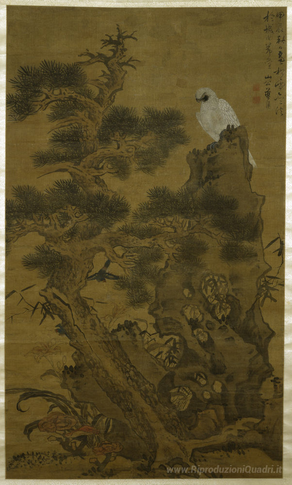 Ti offriamo una riproduzione artigianale su tela dell'opera famosa 'Pino, Falco Bianco, e rock' di Lan Ying, dal Museo delle Riproduzioni.