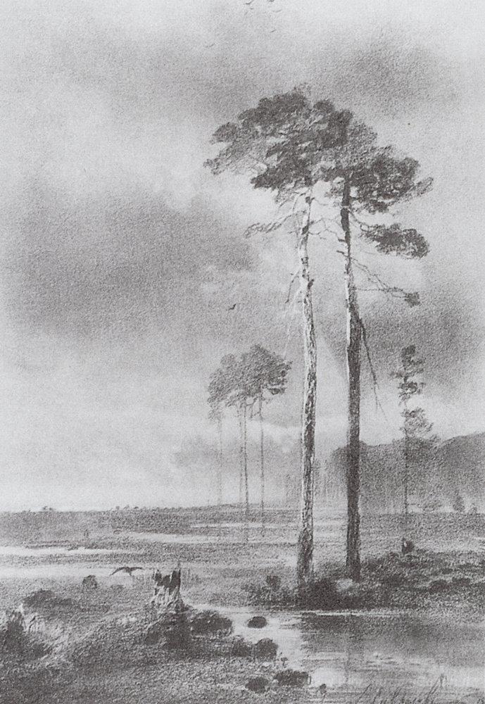 Ti offriamo una riproduzione artigianale su tela dell'opera famosa 'Pino in palude' di Aleksey Savrasov, dal Museo delle Riproduzioni.