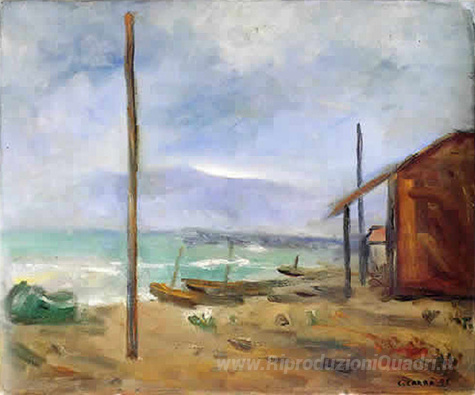Ti offriamo una riproduzione artigianale su tela dell'opera famosa 'Pioggia al mare' di Carlo Carra, dal Museo delle Riproduzioni.