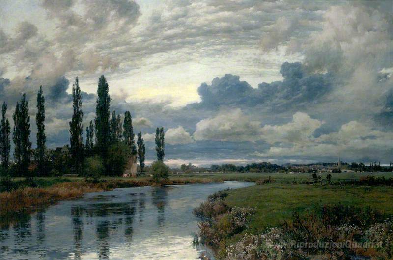 Ti offriamo una riproduzione artigianale su tela dell'opera famosa 'Pioppi in Valle del Tamigi' di Alfred Parsons, dal Museo delle Riproduzioni.