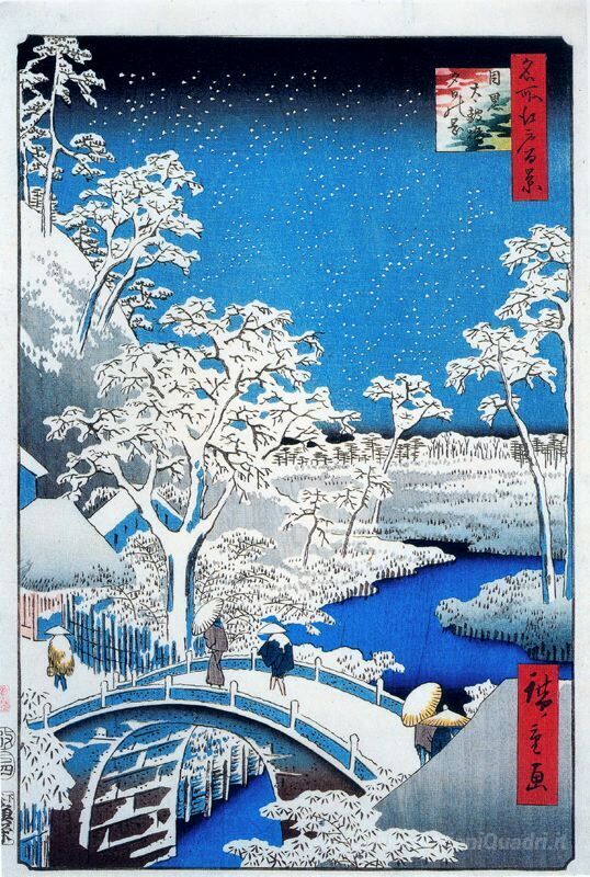 Ti offriamo una riproduzione artigianale su tela dell'opera famosa 'Ponte di tamburo e Setting Sun Hill, Meguro' di Hiroshige, dal Museo delle Riproduzioni.
