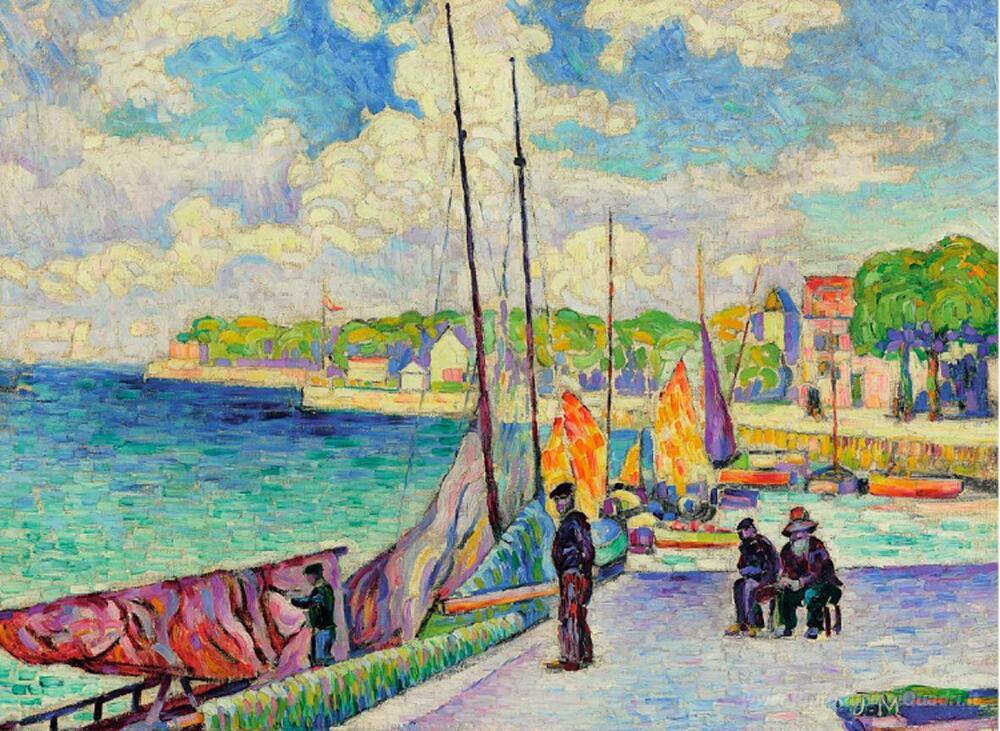 Ti offriamo una riproduzione artigianale su tela dell'opera famosa 'Porto Petit, pecheurs et bateaux au quai' di Jean Metzinger, dal Museo delle Riproduzioni.