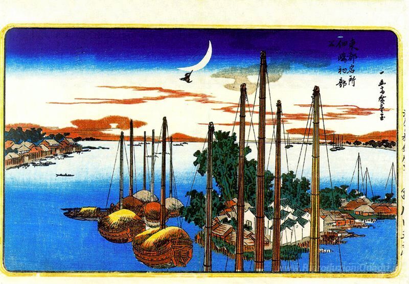 Ti offriamo una riproduzione artigianale su tela dell'opera famosa 'Prima Cuckoo dell'anno al Tsukudajima' di Hiroshige, dal Museo delle Riproduzioni.