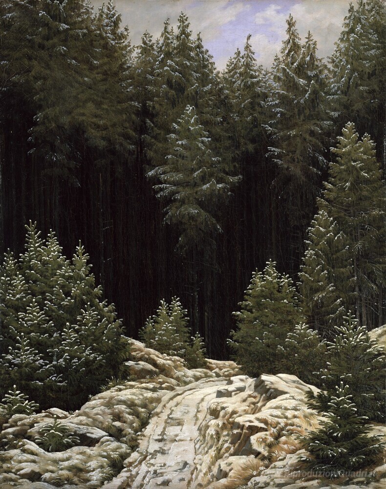 Ti offriamo una riproduzione artigianale su tela dell'opera famosa 'Prima neve' di Caspar David Friedrich, dal Museo delle Riproduzioni.