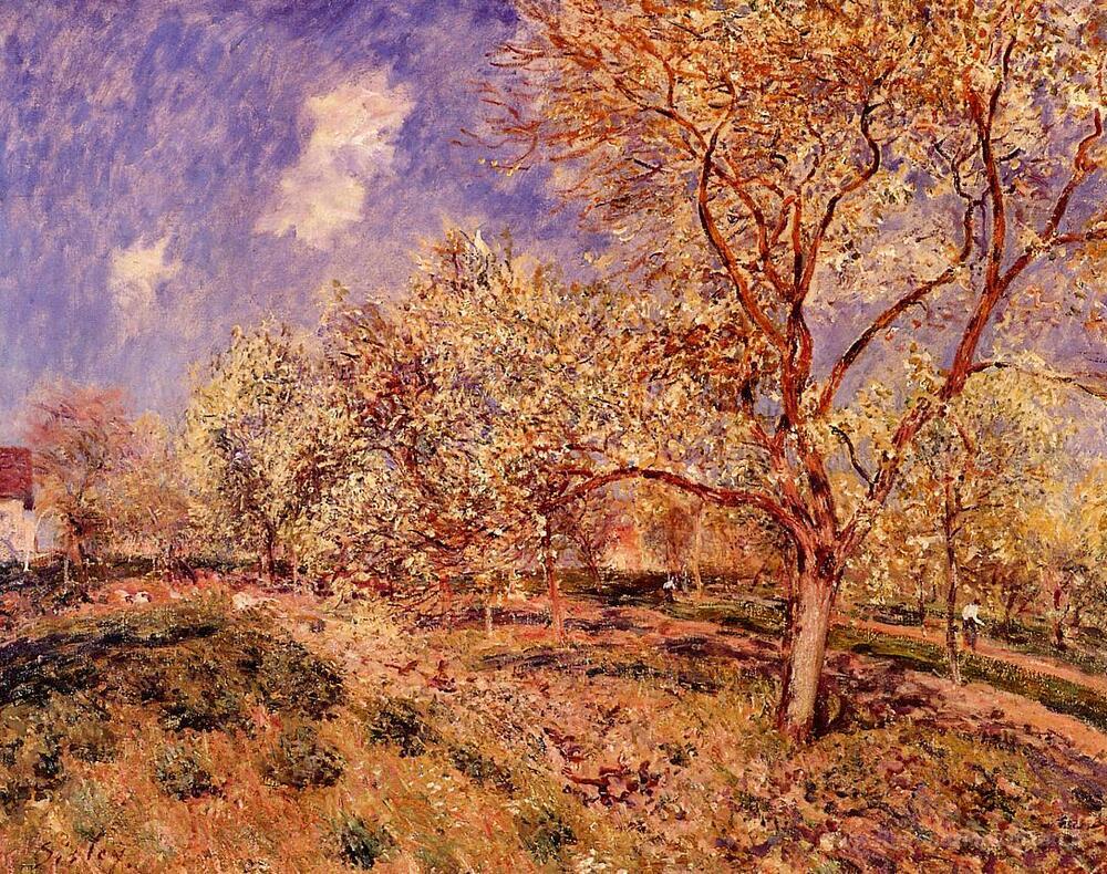 Ti offriamo una riproduzione artigianale su tela dell'opera famosa 'Primavera a Veneux' di Alfred Sisley, dal Museo delle Riproduzioni.