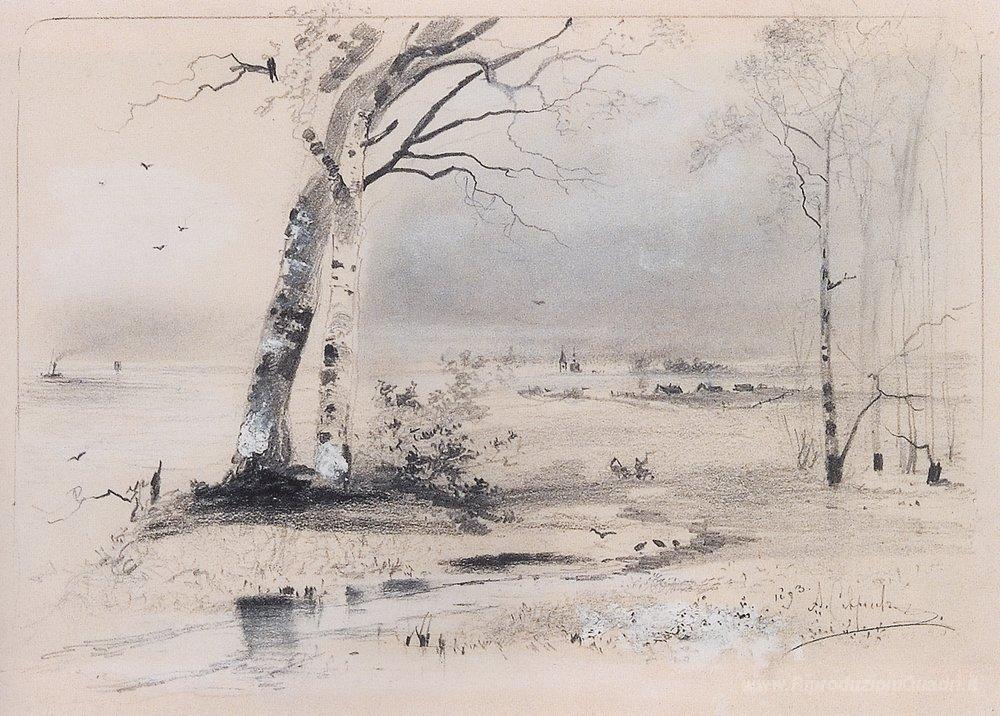 Ti offriamo una riproduzione artigianale su tela dell'opera famosa 'Primavera in anticipo. Betulle dal fiume' di Aleksey Savrasov, dal Museo delle Riproduzioni.
