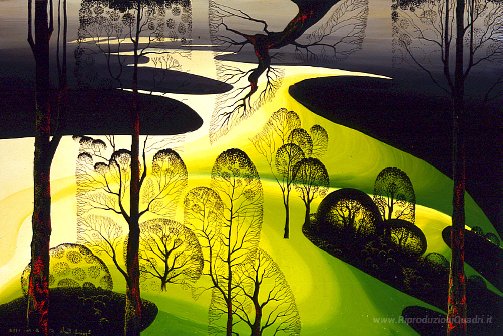Ti offriamo una riproduzione artigianale su tela dell'opera famosa 'Primavera in anticipo' di Eyvind Earle, dal Museo delle Riproduzioni.