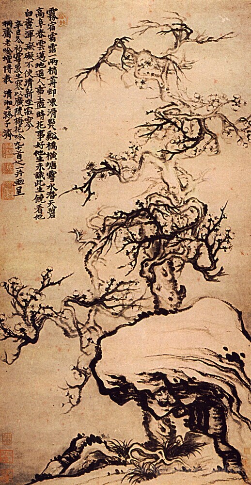 Ti offriamo una riproduzione artigianale su tela dell'opera famosa 'Prunus tra le rocce' di Shitao, dal Museo delle Riproduzioni.