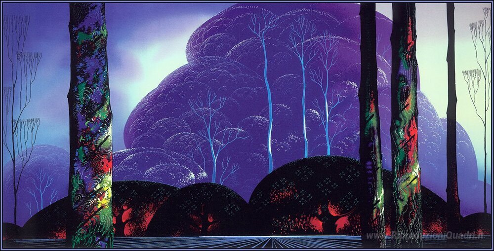 Ti offriamo una riproduzione artigianale su tela dell'opera famosa 'Purple Sunset' di Eyvind Earle, dal Museo delle Riproduzioni.
