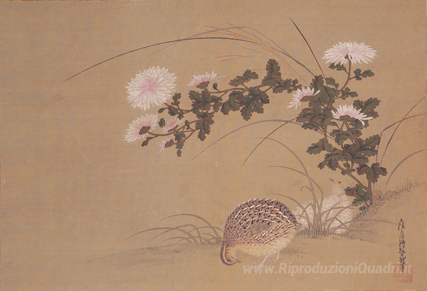 Ti offriamo una riproduzione artigianale su tela dell'opera famosa 'Quaglie e Crisantemi' di Tosa Mitsuoki, dal Museo delle Riproduzioni.